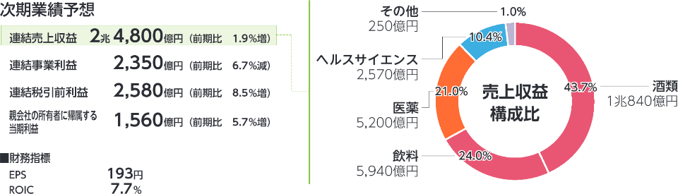 組織能力の強化により、酒類、飲料・ヘルスサイエンス、医薬の各事業が自律的に成長し、かつ事業の掛け合わせによるシナジーを最大化することを目指します。特に、ヘルスサイエンス事業のアジア・パシフィックを中心とした成長を加速し、グループの第3の柱として収益性を高めます。