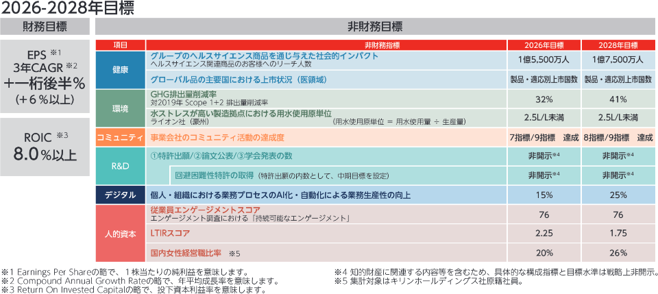 事業の稼ぐ力を高めるとともに、株主利益の更なる向上のため引き続き当期利益を重視した経営を進め、「EPS」及び「ROIC」の財務目標達成を目指します。非財務目標については、新たに「R&D(研究開発)」「デジタル」を加え、各項目の達成を通じて持続的成長を実現します。
