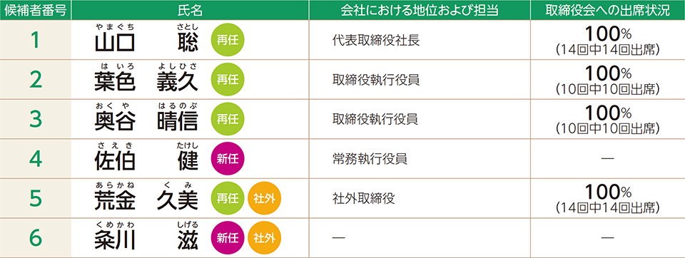 山口聡氏は、代表取締役社長として、当社のグループ経営を担っており、ビジョンや中期経営計画に基づき、「野菜の会社」の実現に向け事業を牽引しております。これらの実績と過去に業務用事業部門、研究部門における豊富な経験を有していることを踏まえ、当社の持続的な成長と中長期的な企業価値向上の実現のために適切な人材として、引き続き取締役として選任をお願いするものです。