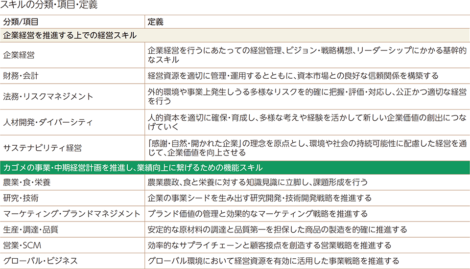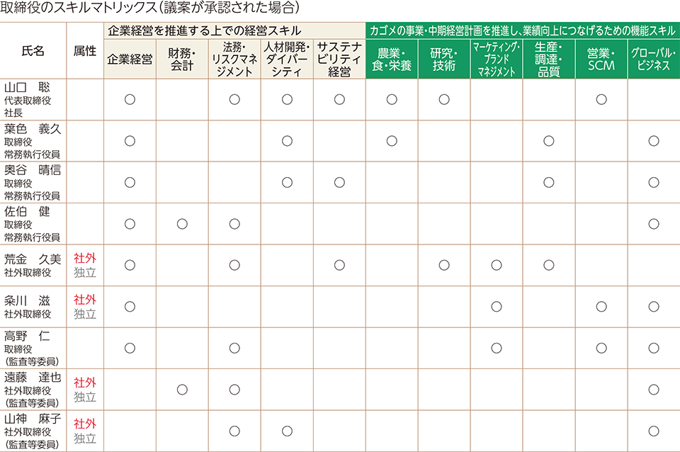 当社は、取締役会のアドバイス機能とモニタリング機能を最大限発揮することで中長期的な企業価値向上を実現させるために、取締役会の構成においては、知識・能力・経験といった面で多様性とバランスを確保しつつ、質の高い審議を行える規模としています。そのために、取締役に必要なスキルとして「企業経営を推進する上での経営スキル」と「カゴメの事業・中期経営計画を推進し、業績向上に繋げるための機能スキル」の計11のスキルを設定しました。スキル保有の認定条件(※)に照らし、各取締役の知識・能力・経験等を踏まえ、保有するスキルを明確にしております。