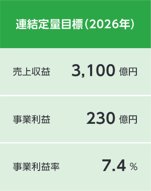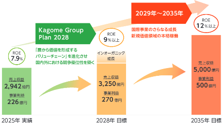 2035年の新たな目標は売上収益5,000億円、事業利益500億円、ROE12%以上です。この目標に向けた最初のステップとなる中期経営計画「Kagome Group Plan 2028」においては、収益基盤の強化と、成長・新規価値領域への資源投下による競争力の強化に取り組み、オーガニック・インオーガニック両面での成長を実現します。
