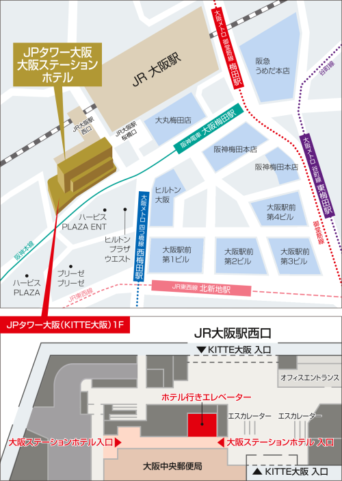 ● ホテルへは、JPタワー大阪(KITTE大阪)1Fのホテル入口または、ホテル正面玄関をご利用ください。