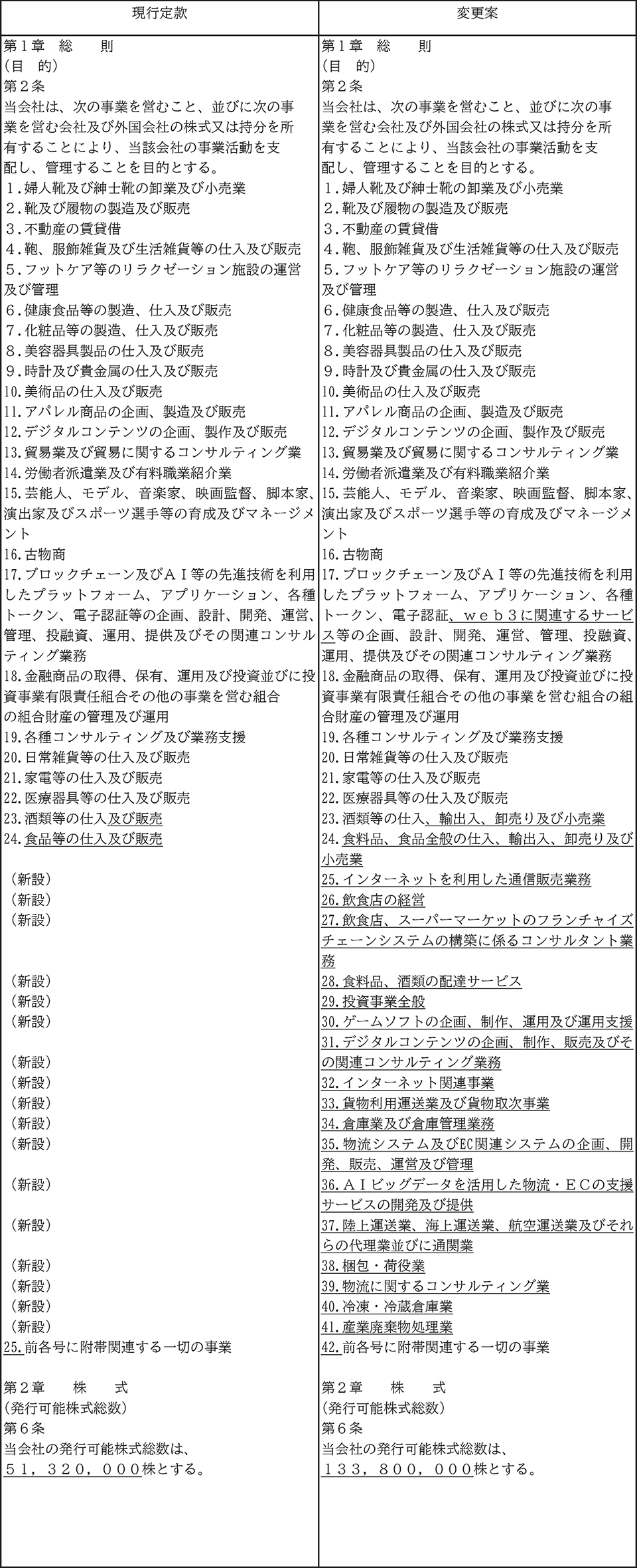 (2) 当社株式の流動性の向上及び将来の事業拡大に備えた機動的な資金調達を可能にするため、現行定款第6条(発行可能株式総数)について、発行可能株式総数を現行の51,320,000株から2025年3月11日時点の発行済株式の総数33,450,000株の4倍に相当する133,800,000株に変更するものであります。
