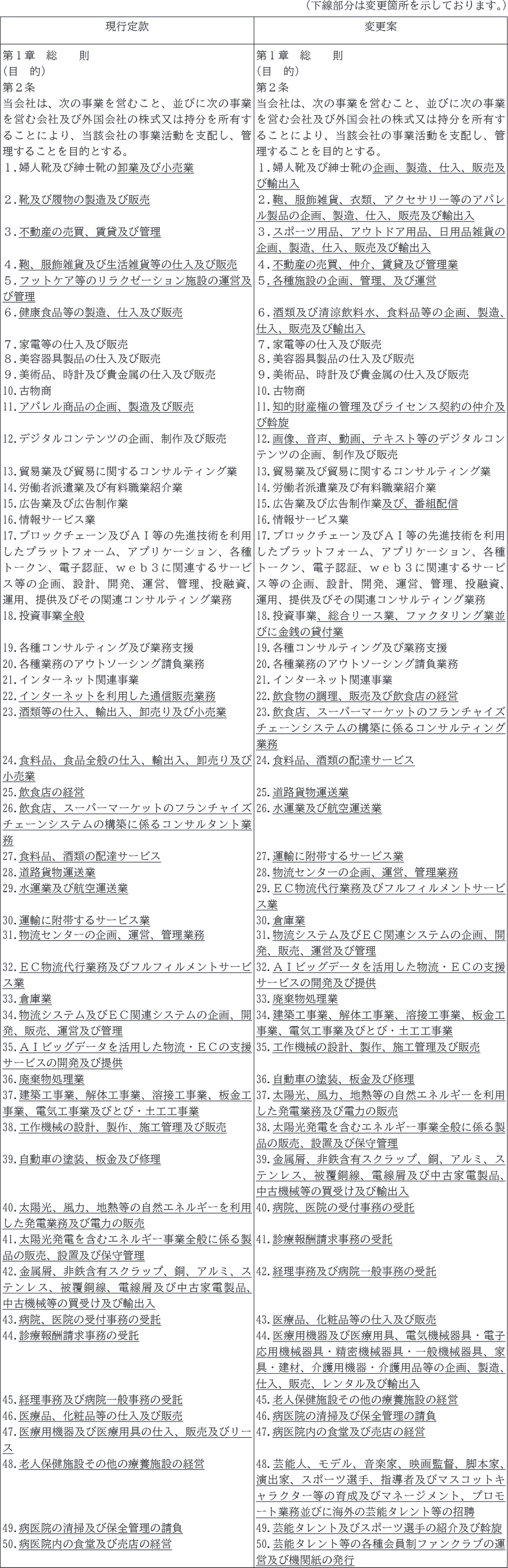 (1) 今後の事業の展開に備えて、現行定款第2条(目的)について事業目的を追加し以降の号数の繰り下げを行い、併せて字句表現の変更を行うものであります。