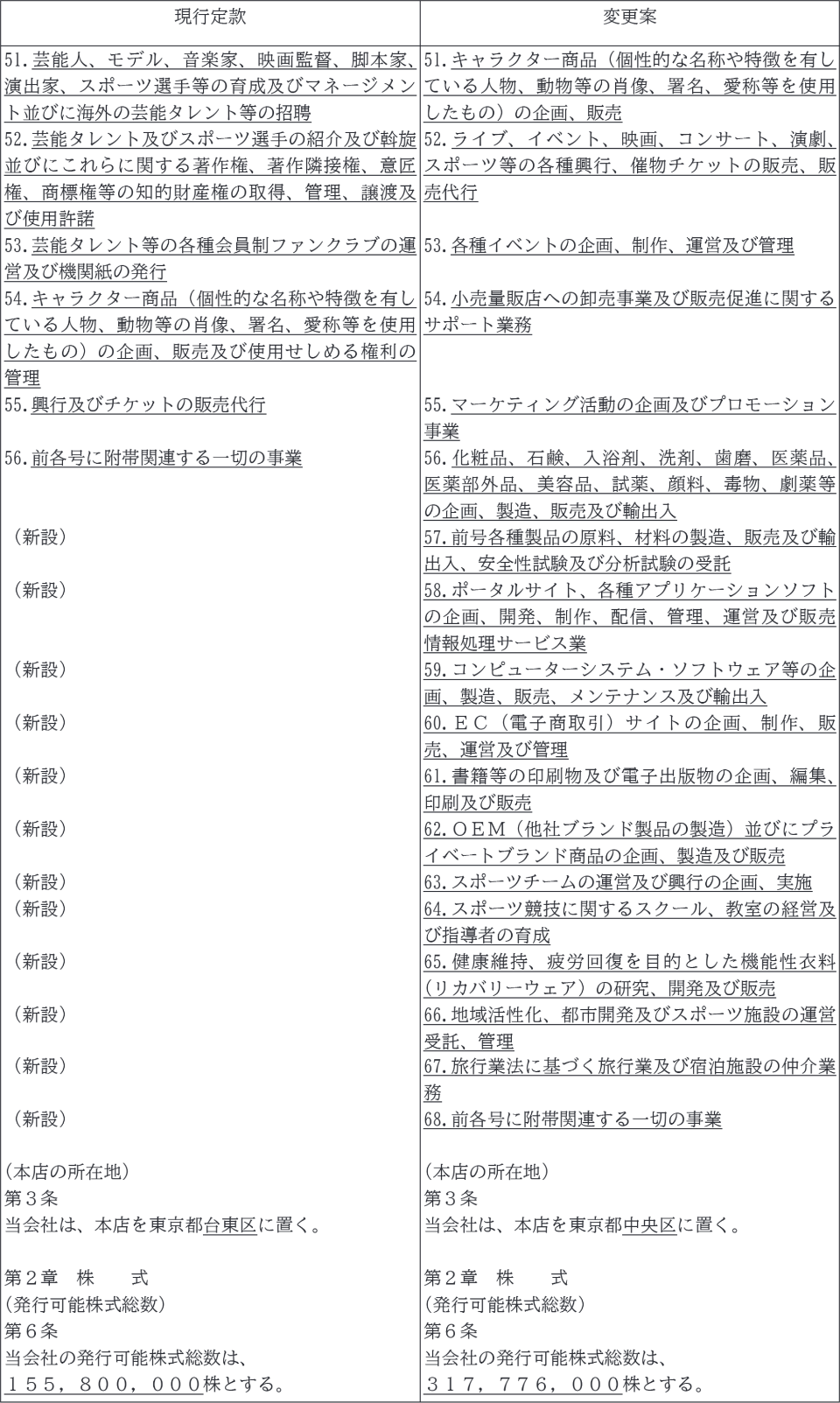 (2) 本社の賃貸契約期間の満了に伴い、今後の事業規模の拡大、事業内容の多様化に柔軟に対応できるオフィス環境を整備するため、現行定款第3条(本店の所在地)について変更するものであります。