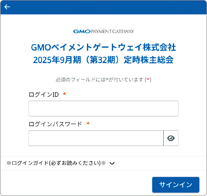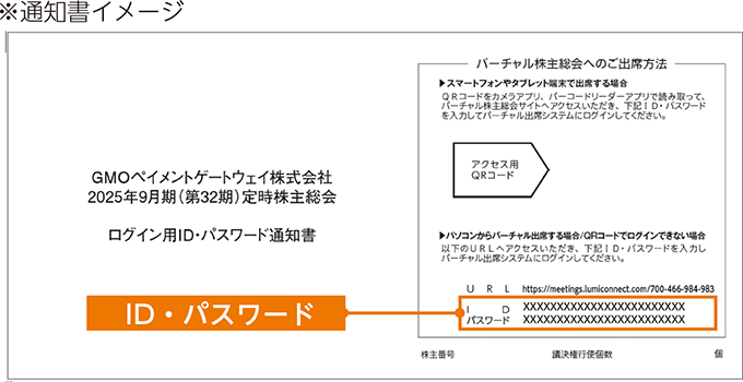 IDとパスワードは議決権行使書用紙に同封の「ログイン用ID・パスワード通知書」をご参照ください。ID・パスワードは株主様ごとに異なります。なお、当該通知書を紛失した場合、再発行が可能ですが、2025年12月5日(金曜日)午後5時までが期限となります。期限経過後の再発行はできかねますのであらかじめご了承ください。