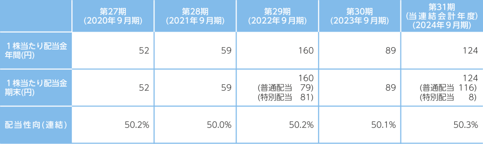 当期の配当については、当期の業績を勘案し普通配当を1株当たり116円とすると共に、2022年9月期まで持分法適用関連会社であった2C2P Pte. Ltd.の株式譲渡価額のうち未確定であった部分が入金されたことや、上場以来順調に業績が拡大していることから、株主の皆様の日頃のご支援にお応えするため、1株当たり8円の特別配当を実施いたしたいと存じます。