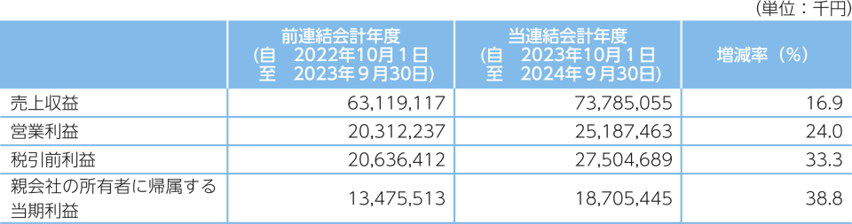 当連結会計年度(2023年10月1日〜2024年9月30日)の業績は、以下のとおりです。