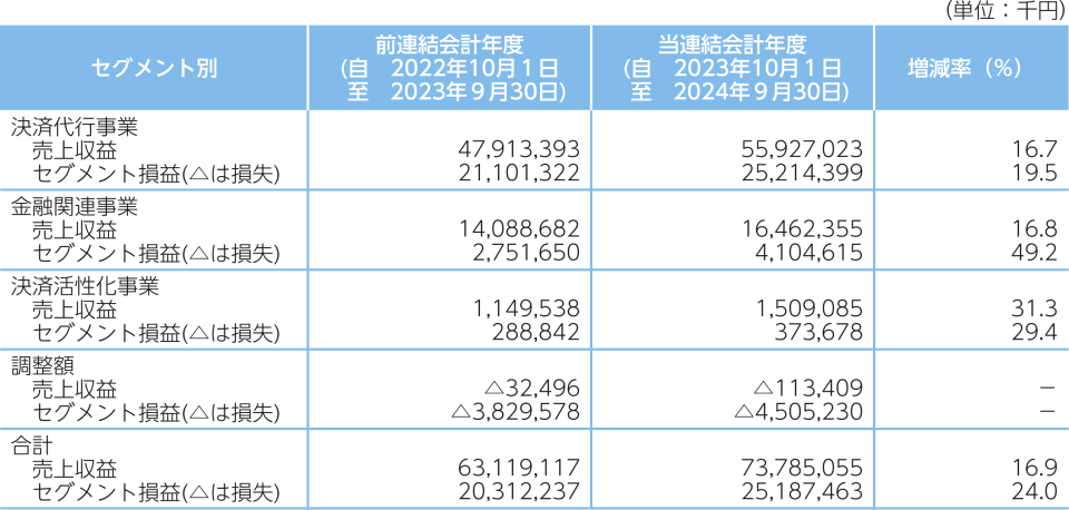 決済代行事業のセグメント利益(営業利益)は25,214,399千円(前年同期比19.5%増)となり、金融関連事業のセグメント利益(営業利益)は4,104,615千円(前年同期比49.2%増)、決済活性化事業のセグメント利益(営業利益)は373,678千円(前年同期比29.4%増)となりました。