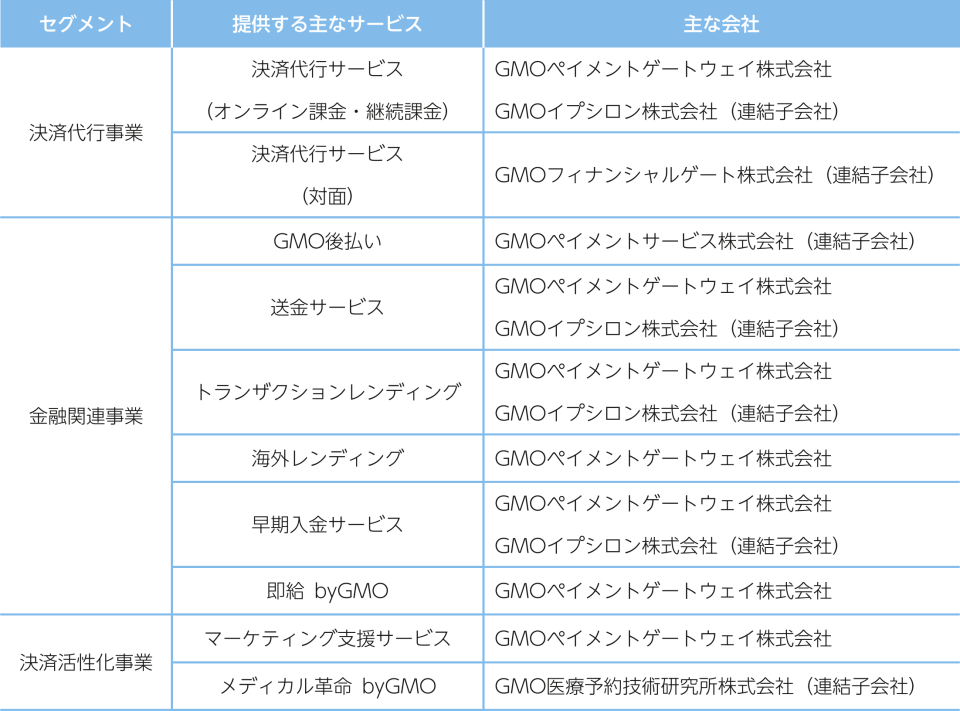 金融関連事業(マネーサービスビジネス:MSB)については、加盟店のキャッシュ・フロー改善に資する早期入金サービスや、加盟店向け融資サービスであるトランザクションレンディング、海外FinTech事業者に向けたレンディングサービス、送金サービス、給与即時受け取りサービスの「即給byGMO」のほか、連結子会社であるGMOペイメントサービス株式会社を通じて「GMO後払い」やBtoB取引向け後払い決済サービス「GMO掛け払い」、三井住友カード株式会社との分割・対面取引にも対応するBNPLサービス「アトカラ」等の後払い決済サービスを提供しております。