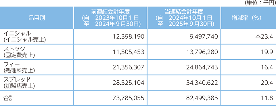 品目別売上収益は、以下のとおりです。イニシャルにおいて前連結会計年度に計上した対面分野における大型案件の反動減の影響がある一方、ストック、フィー及びスプレッドが順調に推移しております。