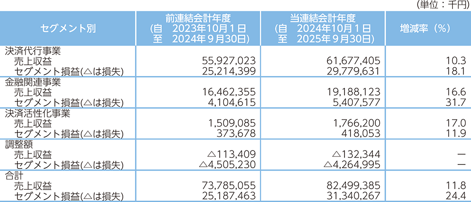 決済代行事業のセグメント利益(営業利益)は29,779,631千円(前年同期比18.1%増)となり、金融関連事業のセグメント利益(営業利益)は5,407,577千円(前年同期比31.7%増)、決済活性化事業のセグメント利益(営業利益)は418,053千円(前年同期比11.9%増)となりました。
