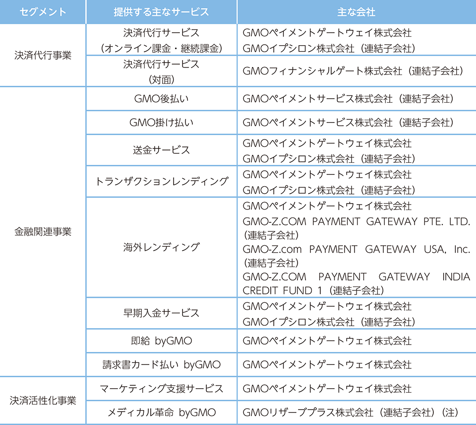 金融関連事業(マネーサービスビジネス:MSB)については、加盟店のキャッシュ・フロー改善に資する早期入金サービスや、加盟店向け融資サービスであるトランザクションレンディング、海外FinTech事業者に向けたレンディングサービス、送金サービス、給与即時受け取りサービスの「即給 byGMO」、BtoB取引の請求書カード払いを可能にする「請求書カード払い byGMO」のほか、連結子会社であるGMOペイメントサービス株式会社を通じて「GMO後払い」やBtoB取引向け後払い決済サービス「GMO掛け払い」、三井住友カード株式会社と共同で展開する分割・対面取引にも対応するBNPLサービス「アトカラ」等の後払い決済サービスを提供しております。