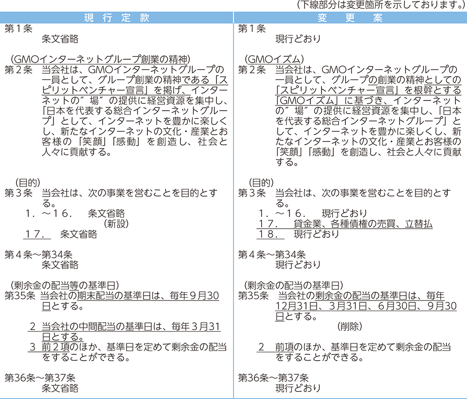 (3)迅速な株主還元を可能とするため、現行定款第35条を四半期ごとの配当が可能となるように変更を行うものであります。