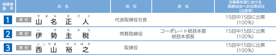 山名正人氏は、当社創立以来、代表取締役社長として、取締役会決議を執行し、会社の業務を統括しております。また、業界動向に関する高い見識を有しております。以上のことから、引き続き取締役候補者といたしました。