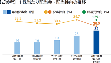 なお、当期の年間配当金は、親会社株主に帰属する当期純利益から当期中に実施した投資有価証券売却益の影響額を除いた1株当たり当期純利益に基づき算出しております。当該投資有価証券の売却により得た資金は全額を自己株式の取得資金に充当しており、自己株式の取得総額も含めた総還元性向は、129.1%となります。