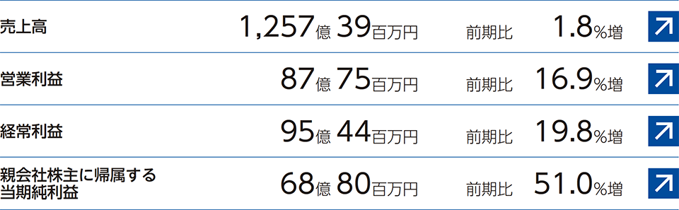 その結果、連結売上高は125,739百万円、前期比1.8%増加、連結営業利益は8,775百万円、前期比16.9%増加、連結経常利益は9,544百万円、前期比19.8%増加、親会社株主に帰属する当期純利益は6,880百万円、前期比51.0%増加となり、3期連続で売上高および各段階利益が過去最高を更新しました。