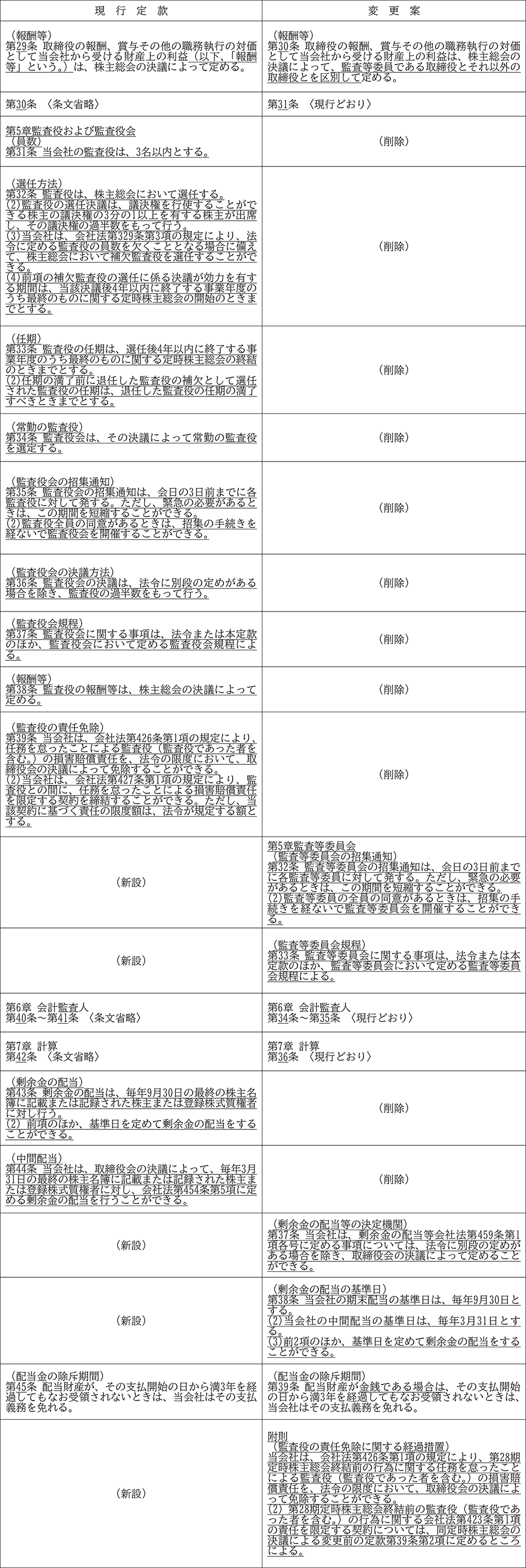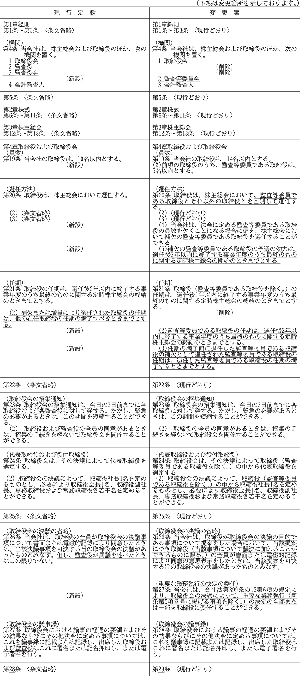 (1)取締役の職務執行の監査等を担う監査等委員を取締役会の構成員とすることにより、取締役会の監督機能を強化し、より一層のコーポレート・ガバナンスの充実を図るため、監査役会設置会社から監査等委員会設置会社へ移行することといたしたく、監査等委員会設置会社への移行に必要な、監査等委員である取締役及び監査等委員会に関する規定の新設並びに監査役及び監査役会に関する規定の削除等の変更を行うものであります。
