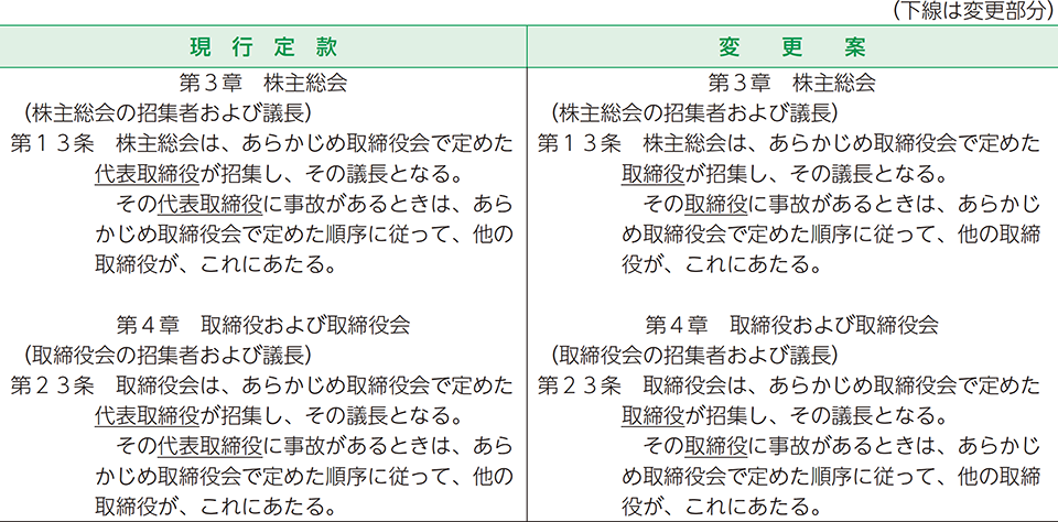1.変更の理由 当社は、株主総会および取締役会の柔軟な運営を可能とすることを目的として、それぞれの議長につき、代表取締役以外の取締役においても務めることができるよう、現行定款第13条(株主総会の招集者および議長)および第23条(取締役会の招集者および議長)の変更を行うものであります。