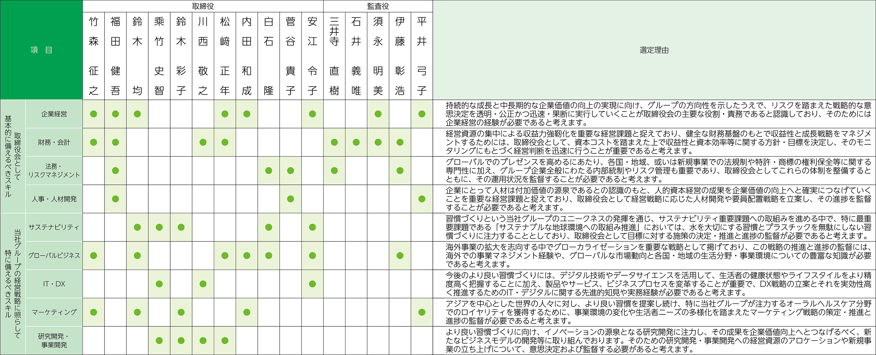 ※経営における最善の意思決定と監督を実現するために、必要かつ代表的な経験・スキルにもとづいて 「●」を付しております。