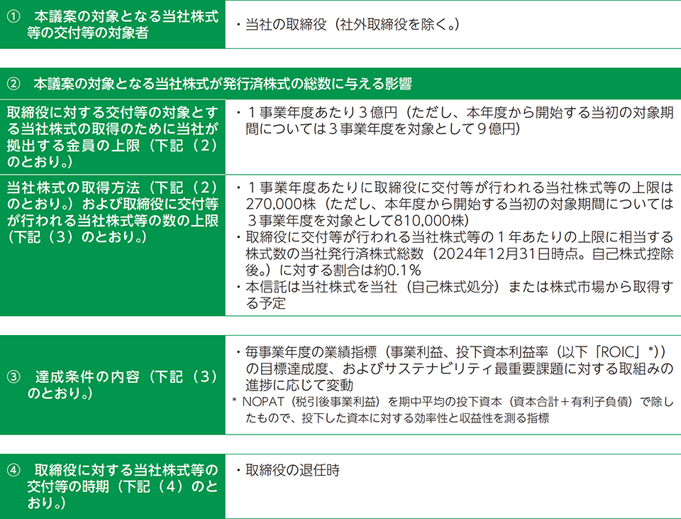 当社は、1事業年度ごとに、取締役に対する交付等の対象とする当社株式の取得のために、3億円(対象期間については9億円)を上限とする金員を、取締役への報酬として追加拠出し、受益者要件を充足する取締役を受益者とする信託期間3年間の信託(以下「本信託」)を継続します。ただし、追加拠出する前の信託期間の末日に信託財産内に残存する、取締役に対する交付等の対象となる当社株式(取締役に付与されたポイント数に相当する当社株式で交付等が未了であるものを除く。)および金銭(以下「残存株式等」)があるときは、取締役に対する交付等の対象となる残存株式等の金額と追加拠出される信託金の合計額は、9億円の範囲内とします。