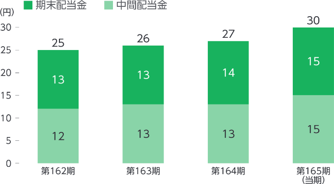 当期の剰余金の配当につきましては、過去の支払実績および配当性向を勘案して、取締役会決議により、1株につき、中間15円(支払開始日:2025年9月2日)、期末15円(支払開始日:2026年3月5日)とさせていただきました。