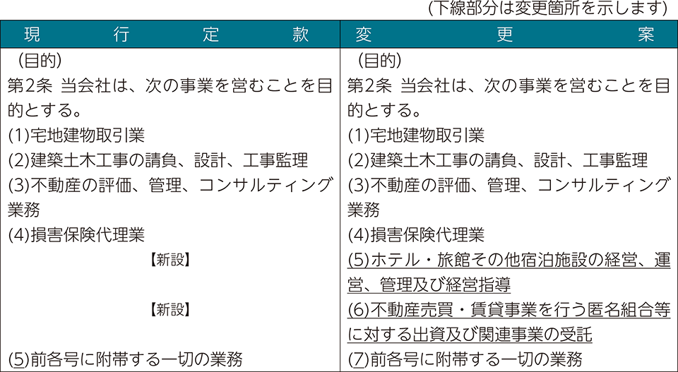 1.提案の理由 当社の事業の現状に即し、事業目的の明確化を図るとともに、今後の事業展開・事業内容の多様化に対応するため、現行定款第2条(目的)について事業目的の追加・変更等を行うものであります。