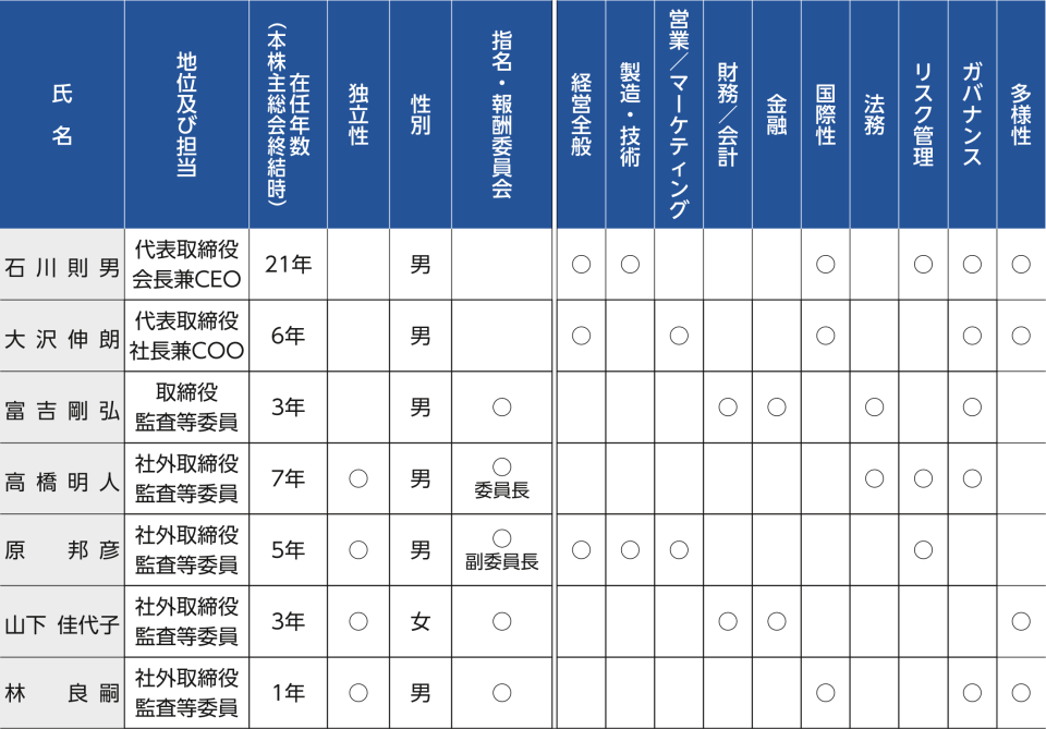 第2号議案が承認された場合の各取締役のスキル・マトリックス 第2号議案が承認された場合の取締役の専門性は下記のとおりです。 なお、下記の一覧表は各取締役の有する全ての知見・経験を表すものではなく代表的と思われるスキルとして表したものです。