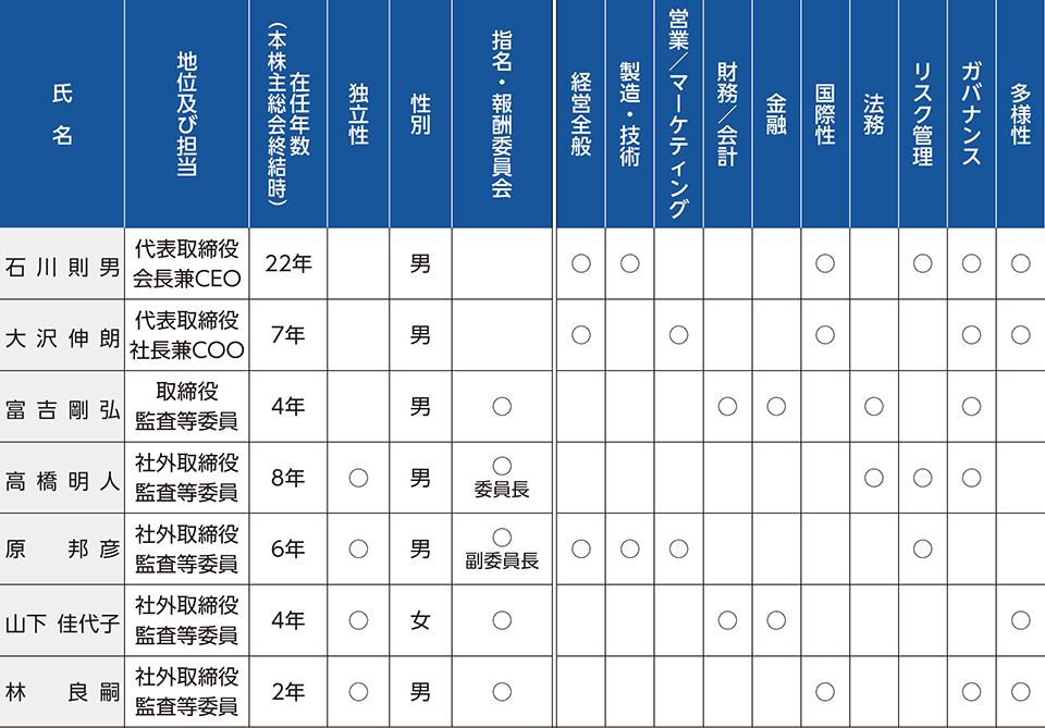 第2号議案、第3号議案が承認された場合の各取締役のスキル・マトリックス 第2号議案、第3号議案が承認された場合の取締役の専門性は下記のとおりです。 なお、下記の一覧表は各取締役の有するすべての知見・経験を表すものではなく代表的と思われるスキルとして表したものです。