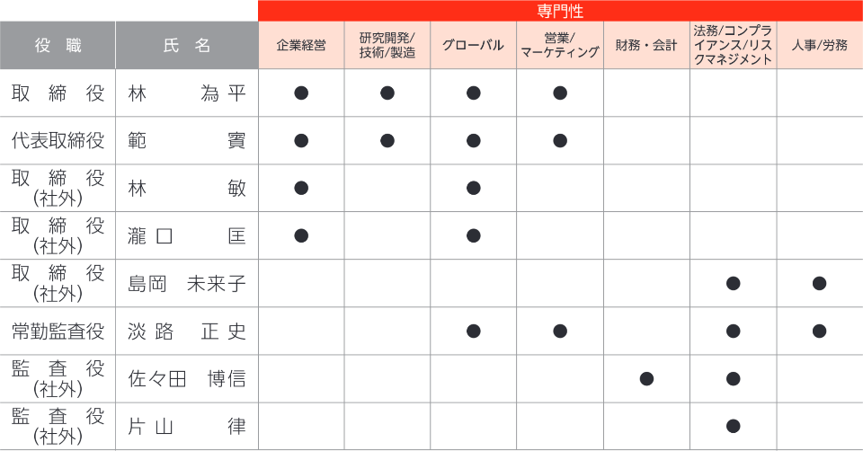 林為平氏は、当社及び当社グループ各社において、技術開発・生産・営業等のマネジメントに携わり、2014年3月から8年間、当社代表取締役として、経営の執行において強いリーダーシップを発揮いたしました。企業経営に関する豊富な経験及び高い見識が、当社経営に貢献できるものと判断し、取締役候補者といたしました。