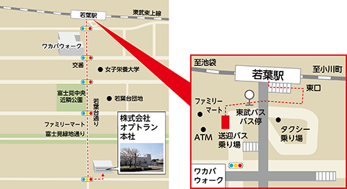 当社送迎バス 乗車停留所 若葉駅東口 出発時間:9時20分、9時45分 降車停留所 株式会社オプトラン本社