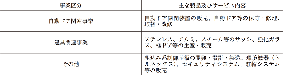 当社グループ(当社及び当社の関係会社)は、当社、子会社2社で構成され、自動ドア開閉装置の販売・設計・施工・保守サービス、ステンレス建具の製造、建築金物の製作、販売を主な事業内容としております。
