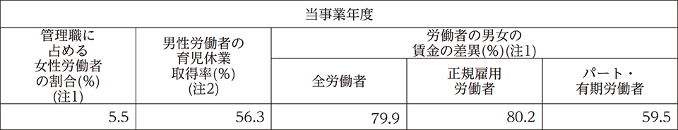 ③ 当社の管理職に占める女性労働者の割合、男性労働者の育児休業取得率及び労働者の男女の賃金の差異