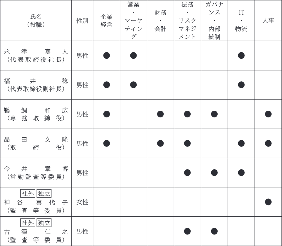 取締役(監査等委員である取締役を除く。)候補者及び監査等委員である取締役の有する主な経験や見識を踏まえ、該当する項目に●印をつけています。