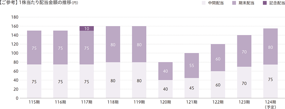 当社は、中期的な利益見通しに加え、将来の投資計画やキャッシュ・フローなどを総合的に勘案し、配当を中心に安定的かつ積極的な利益還元に取り組むことを基本方針としております。 当期期末配当金につきましては、かかる基本方針に基づき、前期の期末配当金から10円増配して1株につき80円とさせていただきたいと存じます。 なお、中間配当金として1株につき75円をお支払いいたしておりますので、年間の配当金は、1株につき155円(前期の年間配当金から15円の増配)となります。