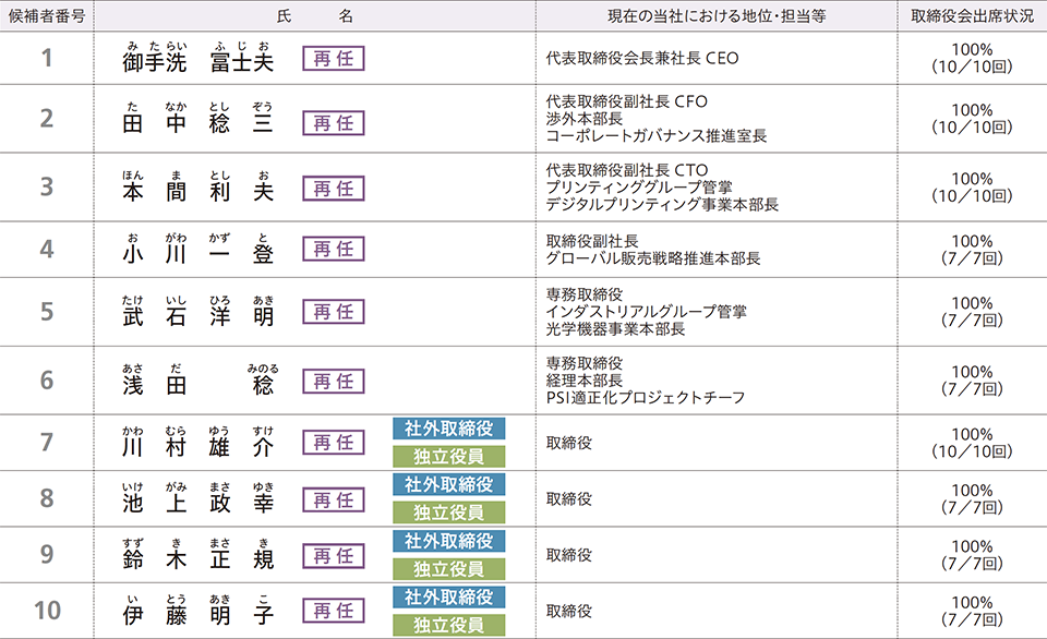 同氏は、長年にわたり複写機の開発・商品化に従事した後、大判プリンターの事業化において大きな成果を上げました。また、調達革新を主導して原価率低減を支える仕組み作りに貢献し、現在、商業印刷を含むプリンティング事業全体を管掌・統括するとともに、CTOとして当社の技術研究開発を統括する立場にあります。その幅広い知識と経験が当社の経営に欠かせないものと判断し、取締役の候補といたしました。
