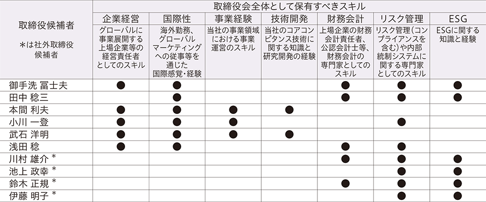 そのような当社において、取締役会が適切な意思決定と執行監督を継続し、以て経営目標を着実に達成していくためには、すべての構成員が「共生」の理念を共有することに加え、当社事業領域に関する市場や技術上の知見、幅広く活動する大規模企業での経営スキル、高度な国際感覚、ESGに関する高度な知識等、取締役会全体として、少なくとも次表7つの領域のスキルを保有する必要があると考えています。