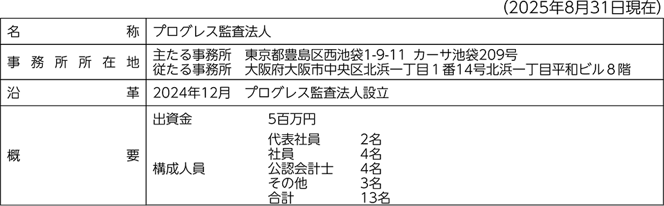 当社の会計監査人でありました監査法人アリアは2025年7月18日開催の監査役会をもって辞任いたしました。これに伴い、今後の円滑な監査業務の遂行及び適時適切な情報開示を実現するため、同日開催の監査役会において、プログレス監査法人を一時会計監査人に選任し、現在に至っております。
