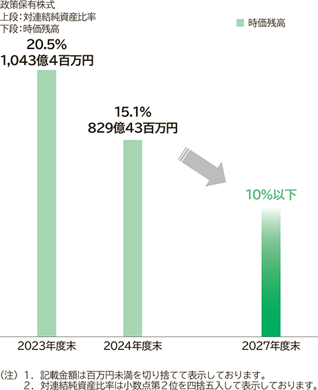 定量目標として、2027年度末までに政策保有株式時価残高の対連結純資産比率を10%以下とすることを掲げております。