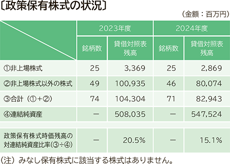 2024年度は一部の政策保有株式の縮減を進めた結果、政策保有株式時価残高は2023年度末の1,043億4百万円から2024年度末には829億43百万円となり、対連結純資産比率は2023年度末の20.5%から2024年度末には15.1%に低下いたしました。