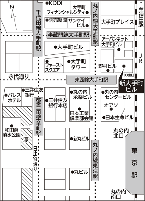 東京メトロ 丸ノ内線・東西線・半蔵門線・千代田線・都営三田線大手町駅 B3出口直結/A5出口より徒歩2分