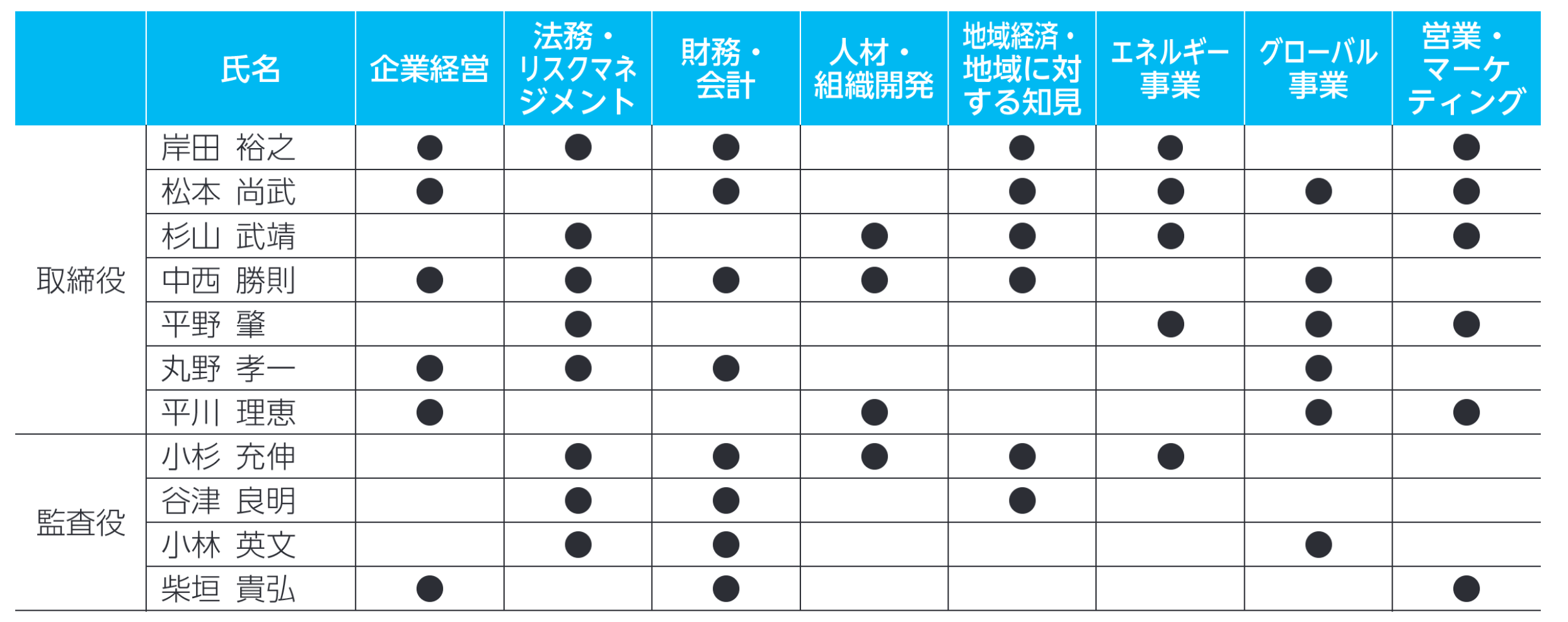 当社の経営・事業戦略に照らして策定した取締役、監査役の有するスキル等の組み合わせは下表のとおりです。