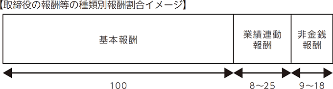 取締役の種類別の報酬割合については、当社と同程度の事業規模や関連する業種・業態に属する企業をベンチマークとする報酬水準を踏まえ、指名・報酬委員会において検討を行う。取締役会(5の委任を受けた代表取締役社長)は、指名・報酬委員会の答申内容を尊重し、当該答申で示された種類別の報酬割合を参考として、取締役の個人別の報酬等の内容を決定することとする。なお、報酬等の種類ごとの比率の目安は、業績連動報酬等は基本報酬の8〜25%程度とし、非金銭報酬等は基本報酬の9〜18%程度とする。