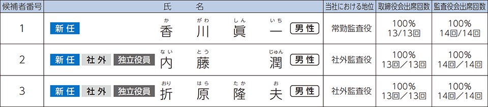 香川眞一氏は、当社の総務・経理部門、コンプライアンス部門及びグループ会社の取締役、監査役並びに長年にわたり常勤監査役を務めた経験を有しており、現場実査に基づく的確な監査が期待できることから、当社の監査体制の強化に有用であると判断し、同氏を当社の監査等委員候補者といたしました。
