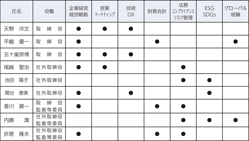 こうした観点から、当社の取締役会にとって必要と考える知識・経験・能力などのスキルを定義しました。本定時株主総会において、第2号議案、第3号議案、第4号議案が、原案どおり承認された場合の各取締役に特に期待するスキル(上位3つまで)は以下のとおりです。