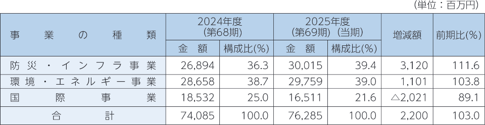 当社グループを取り巻く事業環境においては、社会インフラの老朽化対策や自然災害の激甚化・頻発化を踏まえた国土強靱化の取り組みが継続し、公共投資は底堅く推移いたしました。これにより、防災・インフラ関連事業は引き続き良好な需要環境が維持されました。一方、環境・エネルギー関連事業においては、中長期的には再生可能エネルギー、資源循環、生物多様性関連分野の市場拡大が見込まれるものの、洋上風力発電分野では、公募・入札スケジュールの後ろ倒しや詳細調査案件の一時的な縮小等により、短期的には需要が減少するなど、不確実性が高まる局面となりました。国際事業においては、各国におけるインフレ動向、政府予算削減等の政策的影響、さらに欧米洋上風力市場の停滞を受け、需要が低迷し採算性が悪化するなど、厳しい結果となりました。